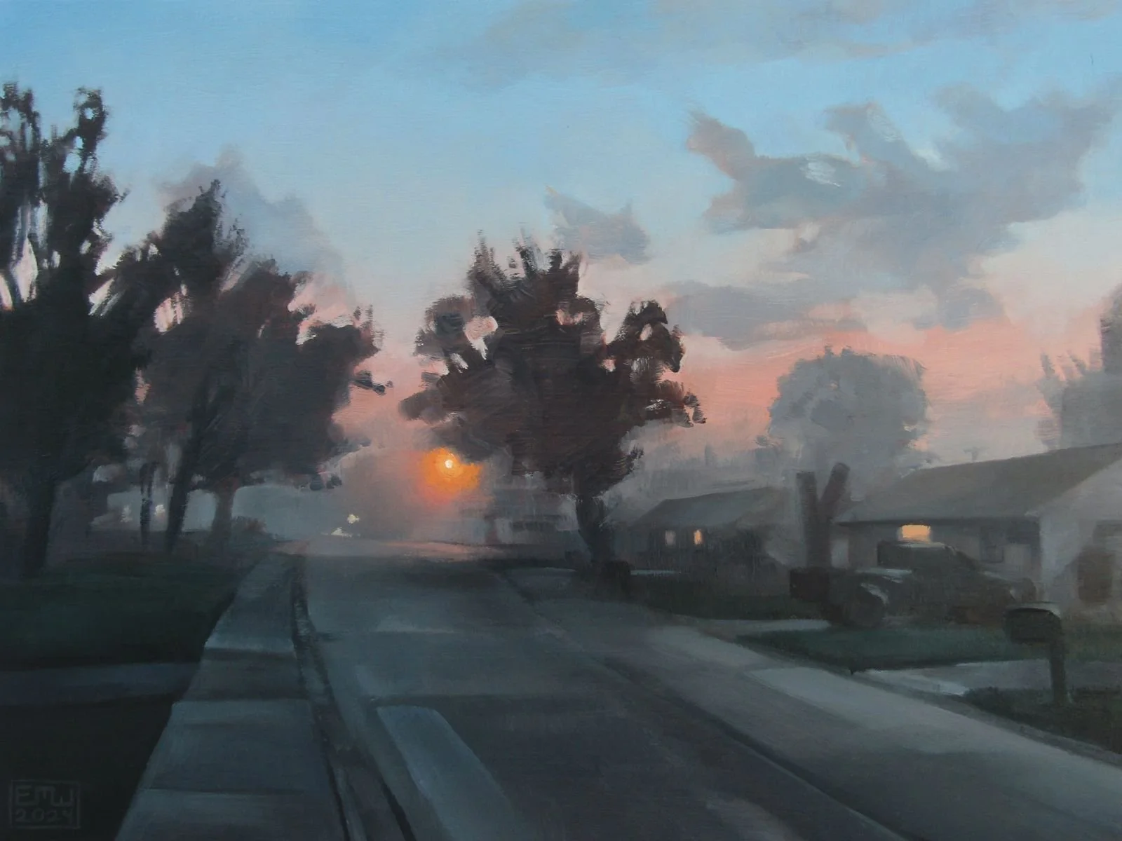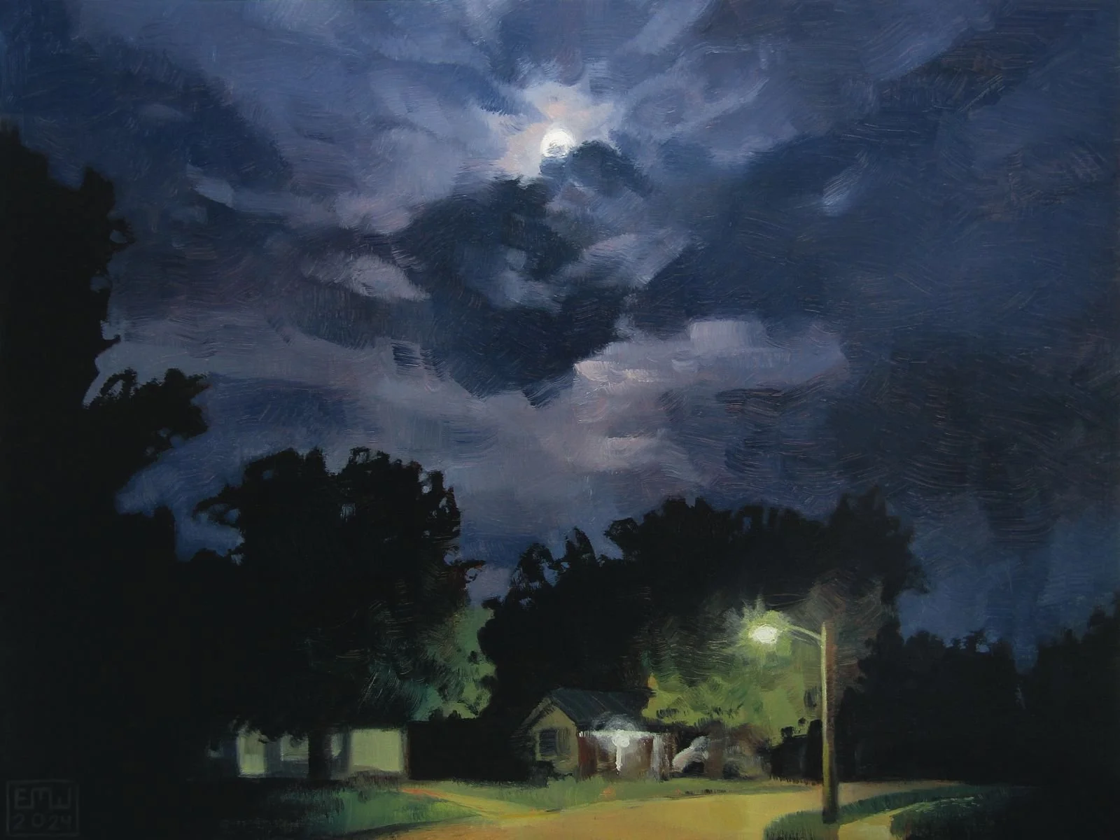 Emily Morgan Wick is a fine artist and illustrator currently based just outside of Dayton, Ohio. After graduating from Columbus College of Art and Design in 2024, she spent the next year painting, returning to her roots and honing her craft. “Recollections” is inspired by the rural landscapes Emily grew up around, nostalgia for run-down streets and open fields, and the contrast between natural and man-made environments. These paintings and prints are memories of long walks through empty neighborhoods and odes to small moments of peace in nature.